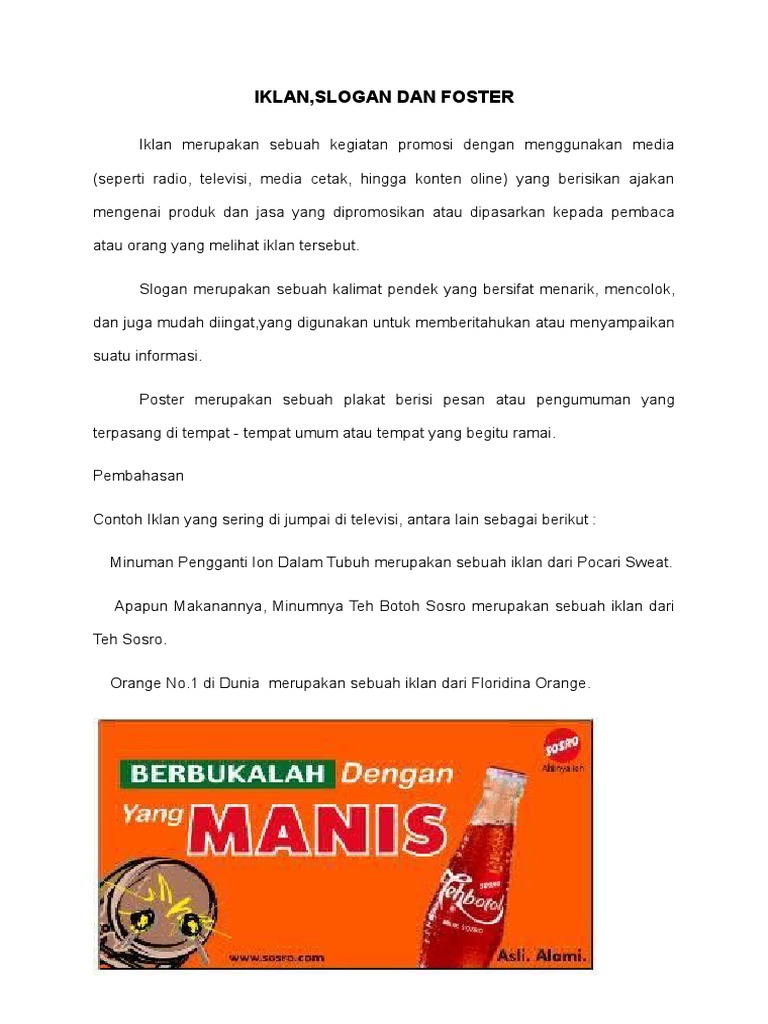 Pengertian iklan, slogan, dan poster 1. Yuk, baca dulu contoh iklan menarik di. Dan biasanya di dalam iklan tersebut terdapat slogan yang menjadi ciri khas dari produk yang di iklankan. Dulu waktu disekolah paling sering tuh disuruh buat slogan dan poster tentang lingkungan. Contohnya, slogan teh sariwangi 3.